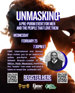 FJMC International invites you to an interactive pre-Purim webinar with Ashanti Branch—creator of the Million Mask Movement and founder of the Ever Forward Club—exploring the “masks” men wear (strength, success, stoicism, humor, control) and what it takes to reveal the more authentic self underneath them. Grounded in the Purim story—where Esther’s hidden identity becomes the turning point—this experience treats masking not as a flaw but as protection that can also become a barrier to connection and wholeness.